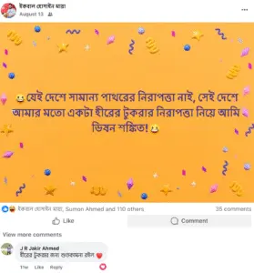 সময়ের অস্থির প্রেক্ষাপটে এক উদ্বেগাকুল হৃদয়ের আকুতি প্রকাশ পেয়েছে এক বক্তব্যে। সম্প্রতি “ইকবাল হোসাইন মায়া” নামের একজন তরুণ সমাজসেবক, পরিষ্কার ধারার রাজনীতিবিদ, ও মেহনতি মানুষের বন্ধু তাঁর অন্তরের গভীর শঙ্কা প্রকাশ করে ফেসবুক পোস্টে বলেছেন, “যেই দেশে সামান্য পাথরের নিরাপত্তা নাই, সেই দেশে আমার মতো একটা হীরের টুকরার নিরাপত্তা নিয়ে আমি ভিষন শঙ্কিত।” এটি কেবল একজন মানুষের ব্যক্তিগত উদ্বেগই প্রকাশ করে না, বরং এটি সমগ্র সমাজের এক সমষ্টিগত উদ্বেগের দর্পণ হয়ে উঠেছে।