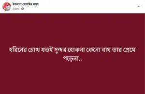 “হরিনের চোখ যতই সুন্দর হোক না কেন, বাঘ তার প্রেমে পড়ে না”—সামাজিক মাধ্যম ফেসবুকে আজ ইকবাল হোসাইন মায়ার এই সরল কিন্তু গভীর রূপকথন পাঠকমহলে নতুনভাবে আলোচনার সৃষ্টি করেছে। এই উপমার মাধ্যমে লেখক প্রকৃতির সহজ সত্যকে মানবসমাজের জটিল সম্পর্কের দর্পণ হিসেবে উপস্থাপন করেছেন।