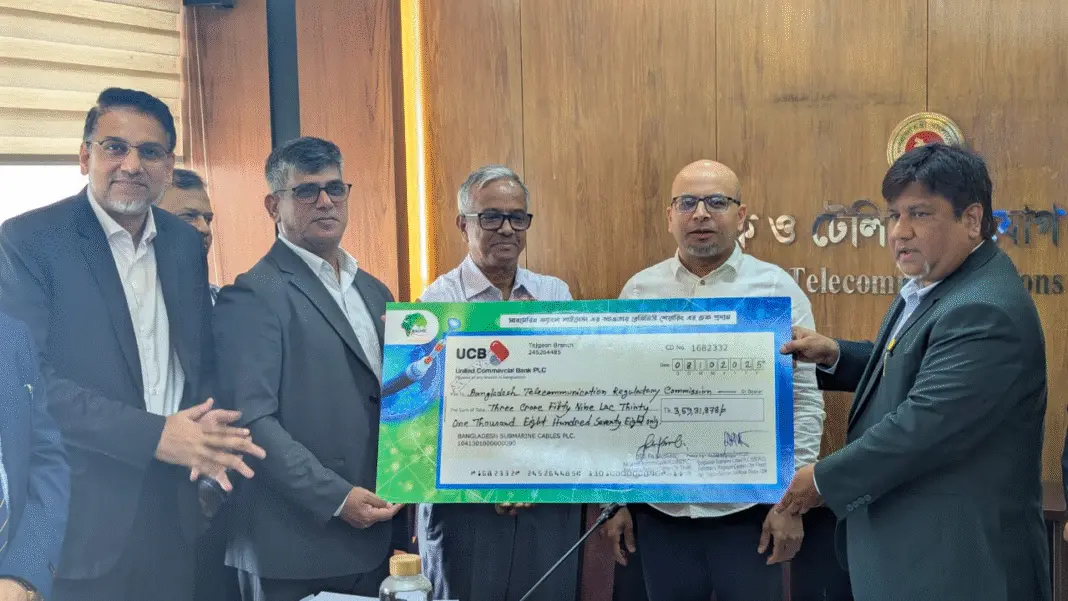 আজ ডাক, টেলিযোগাযোগ ও তথ্যপ্রযুক্তি মন্ত্রণালয়ের দায়িত্বপ্রাপ্ত প্রধান উপদেষ্টার বিশেষ সহকারী ফয়েজ আহমদ তৈয়্যব এর উপস্থিতিতে ডাক ও টেলিযোগাযোগ বিভাগের সচিব আব্দুন নাসের খান উক্ত চেকসমূহ বাংলাদেশ টেলিযোগাযোগ নিয়ন্ত্রণ কমিশনের চেয়ারম্যান মেজর জেনারেল মো. এমদাদ উল বারী এর নিকট হস্তান্তর করেন। এই সময় সাবমেরিন ক্যাবলস এর ব্যবস্থাপনা পরিচালক মো. আসলাম হোসেন -সহ ডাক ও টেলিযোগাযোগ বিভাগ, বিটিআরসি ও সাবমেরিন ক্যাবলস এর ঊর্ধ্বতন কর্মকর্তাবৃন্দ উপস্থিত ছিলেন।